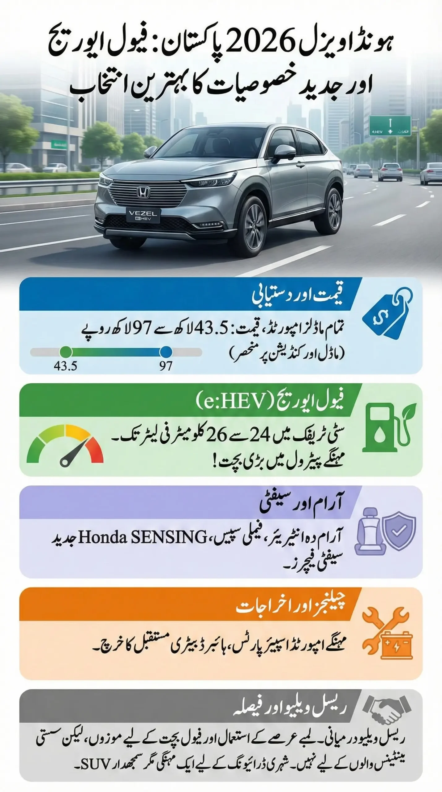 For 2026 Pakistani buyers, the Honda Vezel remains a premium, fuel-smart urban SUVโnot cheap, but sensible if chosen wisely.