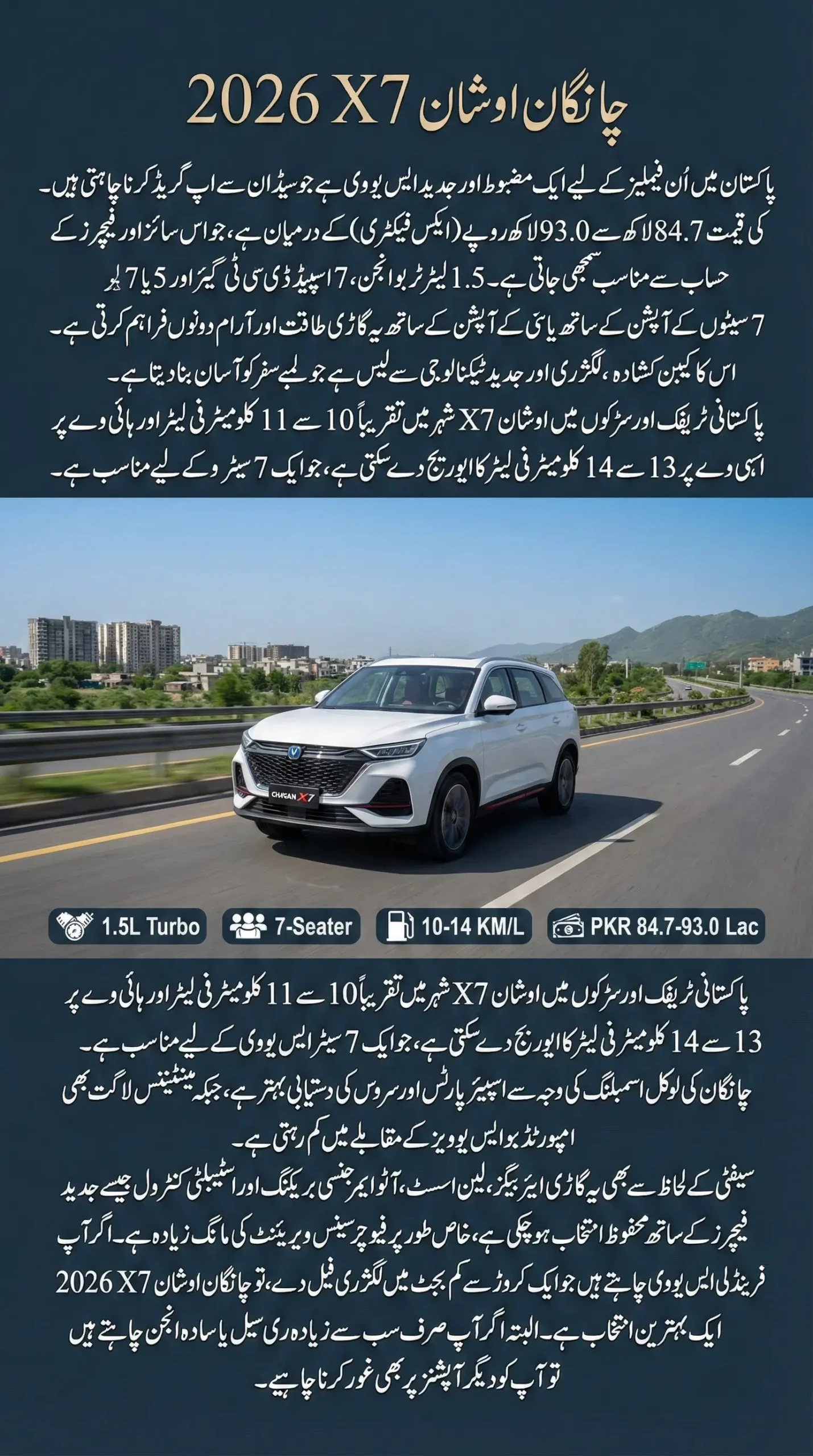 It delivers a reasonable fuel average for Pakistani roads and traffic, while local assembly ensures manageable maintenance and parts availability. With premium interior, advanced safety features, and strong road presence, the Oshan X7 is ideal for families wanting luxury without crossing the 1-crore mark.