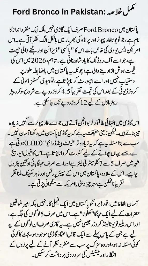 However, owning one requires patience: you face strict Left-Hand Drive import regulations, high maintenance costs, and difficult spare parts availability. With a fuel average of just 5-7 km/l and no official warranty, it is not a practical family car. The Bronco is a luxury toy for enthusiasts who want personality over the resale safety of a Land Cruiser.