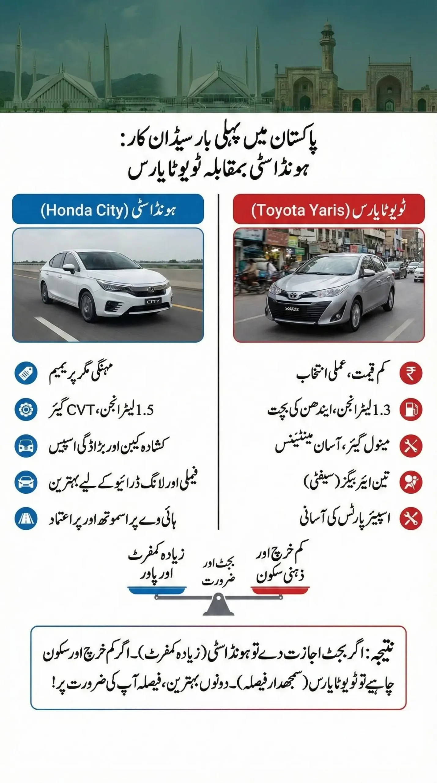This honest comparison between Honda City and Toyota Yaris helps Pakistani buyers clearly understand what they are paying for. Honda City is more expensive but offers a stronger engine, CVT automatic transmission, better comfort, and larger boot space, making it ideal for families and highway use.