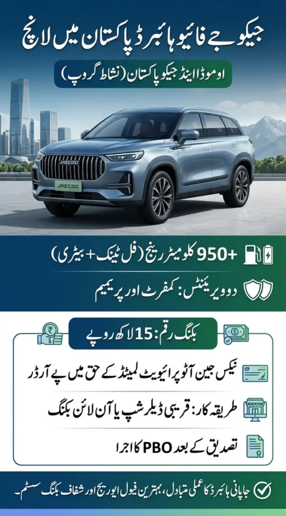 Buyers can book the vehicle by paying a PKR 1.5 million booking amount through a Pay Order in favor of NexGen Auto Private Limited. Customers can choose an authorized dealership or book online, receive a Provisional Booking Order (PBO), and secure their delivery slot. With hybrid efficiency and a clear booking system, the Jaecoo J5 is emerging as a smart option for Pakistani buyers.