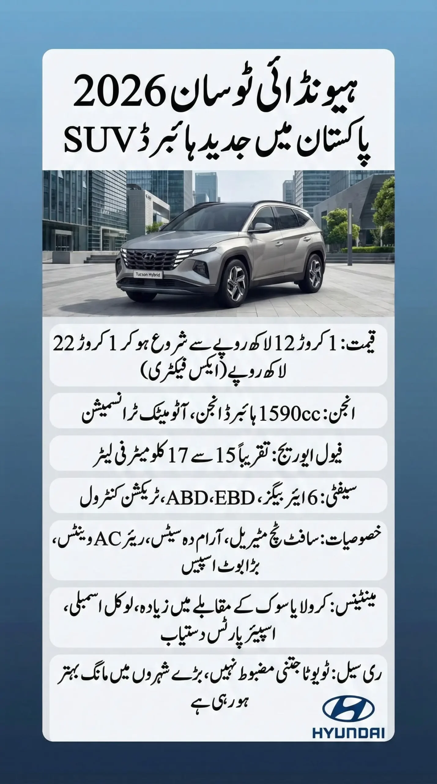 Hyundai Tucson 2026 is not cheap, but it delivers comfort, safety, and fuel efficiency that Pakistani families actually need today. Itโs a sensible SUV not flashy, but smart.