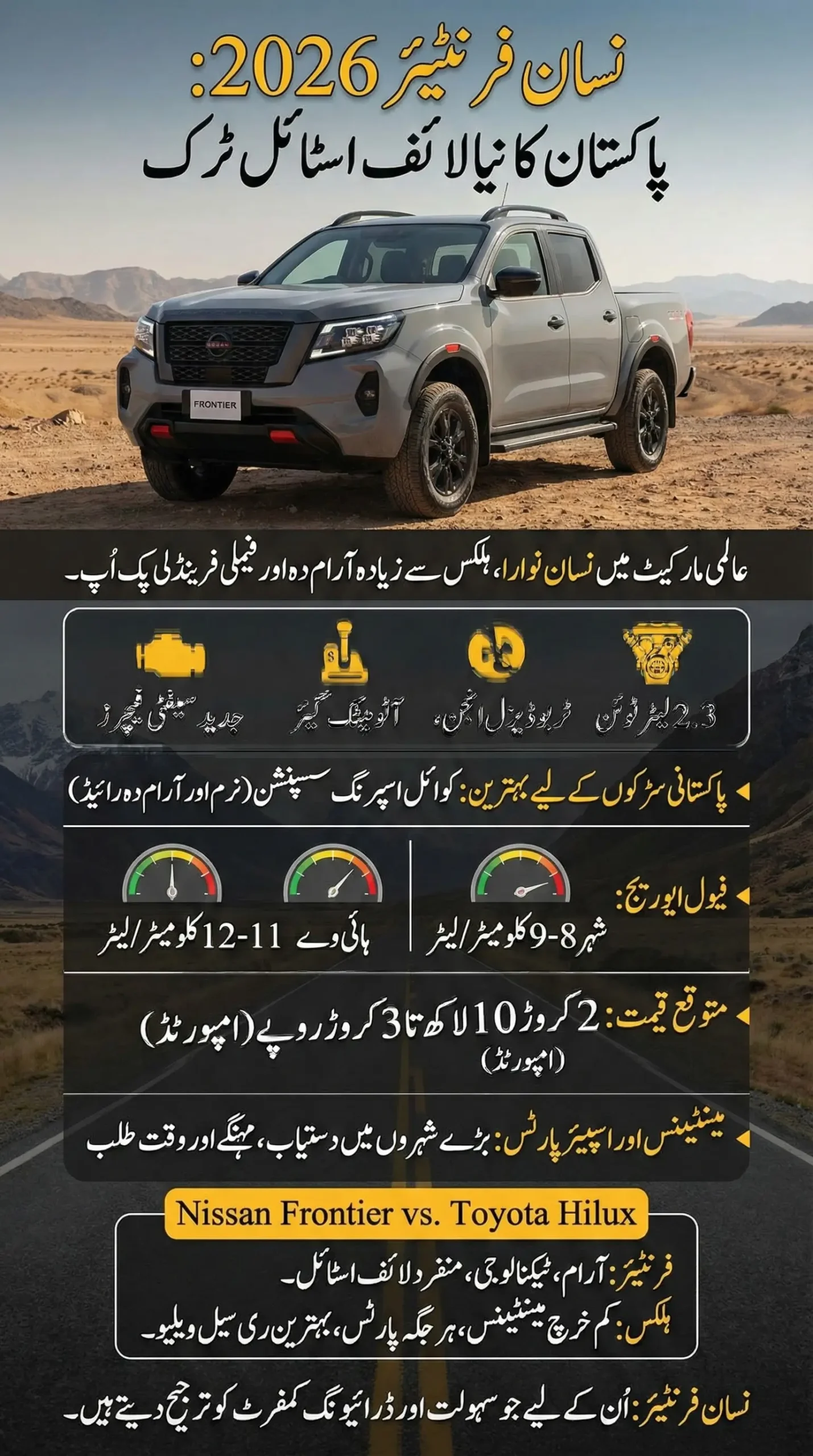 The Nissan Frontier 2026 is a modern double-cabin pickup designed not just for work, but for family comfort and lifestyle use. Internationally, it competes directly with Toyota Hilux, but with a softer ride and more features.