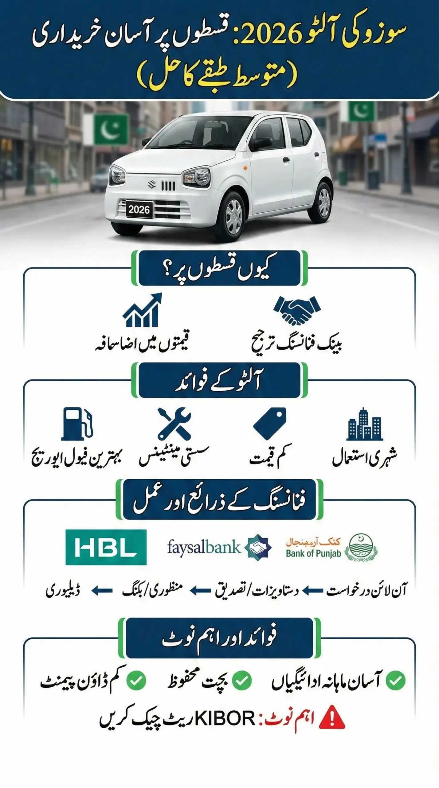 Suzuki Alto 2026 on easy installments has become a practical solution for Pakistani buyers struggling with rising car prices. Instead of paying full cash, customers can now finance the Alto through banks like HBL, Faysal Bank, and Bank of Punjab. The process is simple, mostly online, and designed for salaried individuals and small business owners.