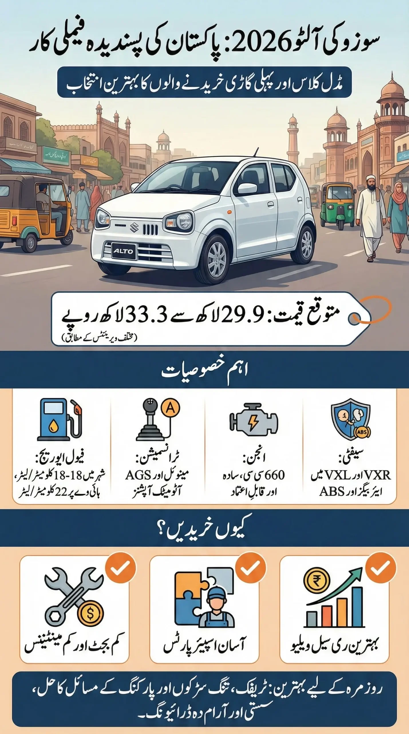 If you want peace of mind, low fuel bills, and a car that any mechanic in Pakistan understands โ Suzuki Alto 2026 still makes sense.