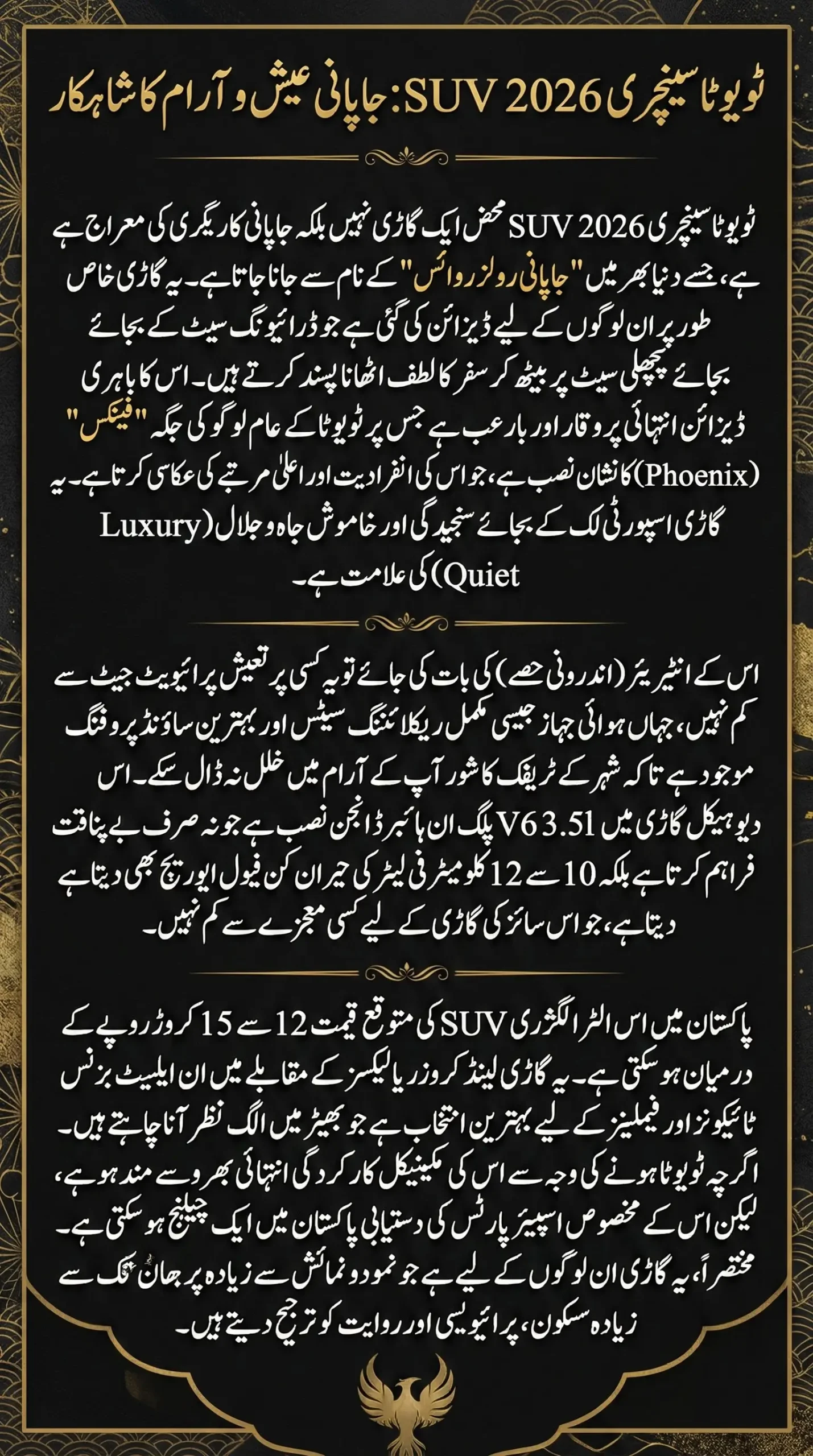 If you have a chauffeur and you spend 2-3 hours a day in the back seat making calls or resting, the Century SUV is arguably the best vehicle in the world for Pakistan. It offers the luxury of a Rolls Royce with the reliability of a Corolla.