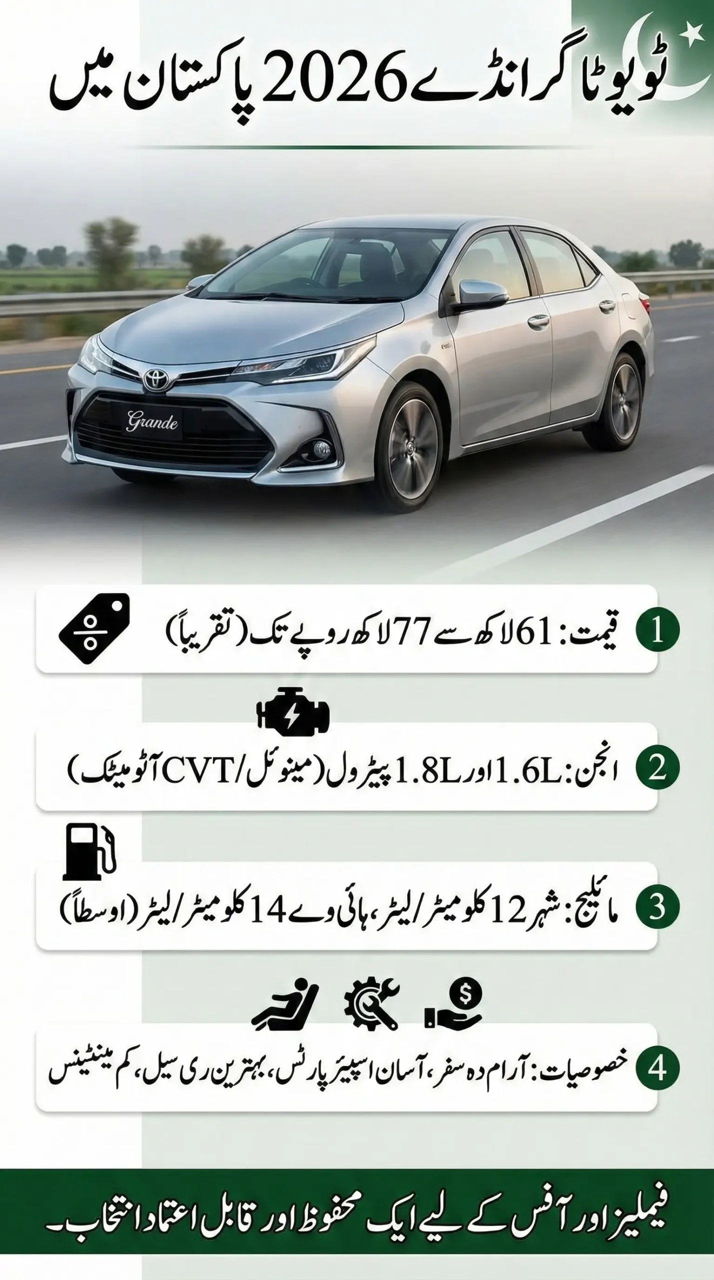 The Toyota Grande 2026 is best for buyers who want a reliable family sedan with proven performance and strong resale. It suits office commuters, small families, and people upgrading from smaller cars. However, buyers looking for the latest global design or advanced features may want to explore other options. For many Pakistani households, this car still feels like a safe and sensible decision.