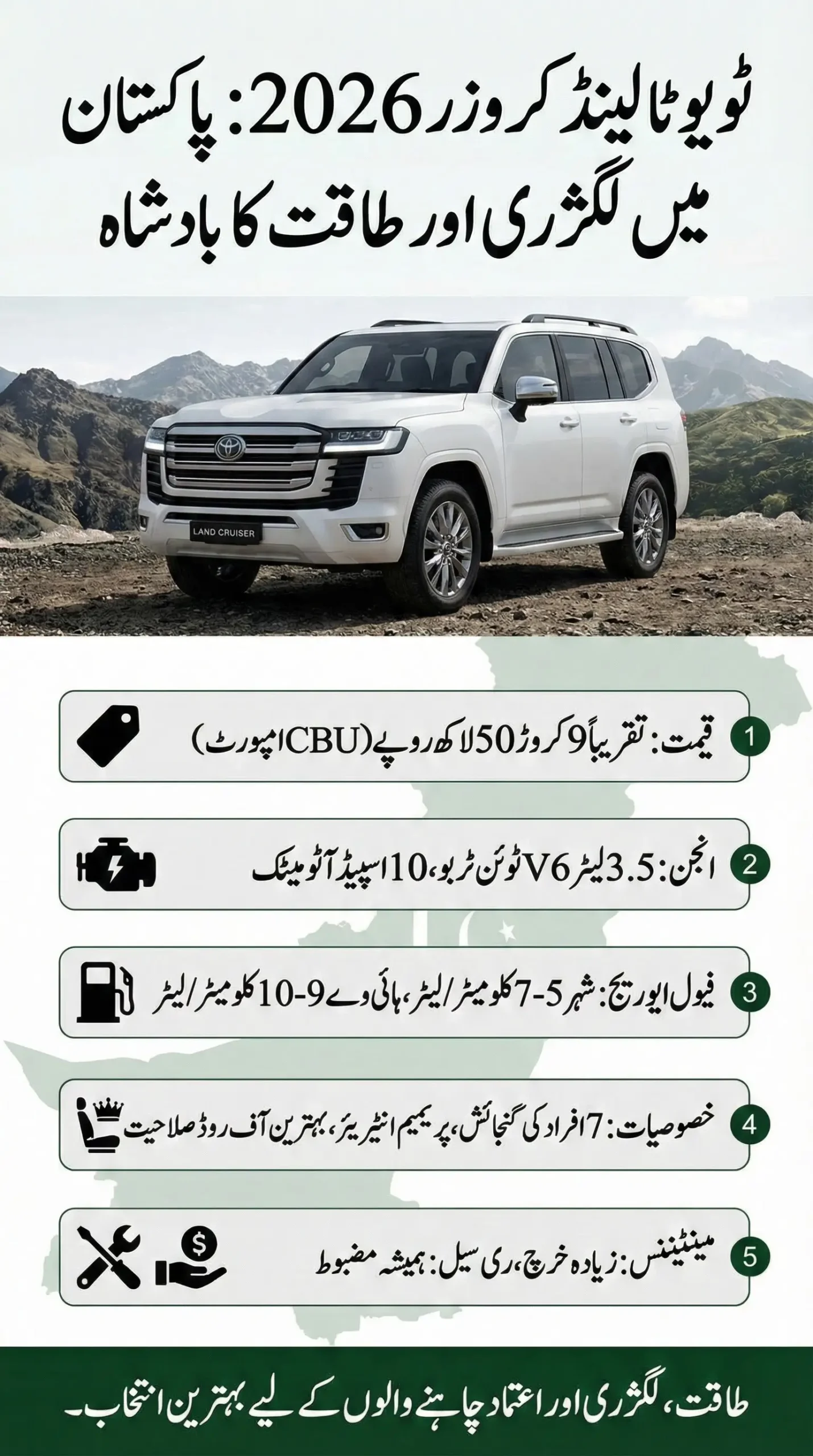 In real Pakistani driving conditions, the Land Cruiser 2026 delivers an average of around 5 to 7 km per liter in city traffic and up to 9 or 10 km per liter on highways. With current petrol and diesel prices, fuel cost is high, but buyers in this segment usually prioritize performance and comfort over economy.